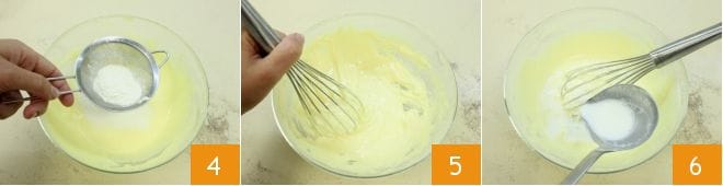 Dann fügen Sie das Mehl hinzu, indem Sie es mit einem Sieb sieben 4, und rühren Sie erneut mit dem Schneebesen, um die Zutaten zu vermischen 5. Wenn die Milch nun heiß ist, schalten Sie die Hitze aus und gießen Sie sie nach und nach in den Eier-, Zucker- und Mehlmix, indem Sie einen kleinen Schöpflöffel verwenden 6. Fügen Sie immer nur wenig auf einmal hinzu und rühren Sie ständig mit dem Schneebesen, um Klumpenbildung zu vermeiden.