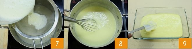Filtern Sie die erhaltene Creme und gießen Sie sie in den Topf, in dem Sie die Milch erhitzt haben 7; kochen Sie die Creme bei schwacher Hitze und rühren Sie dabei ständig mit einem Schneebesen 8, bis sie leicht aufkocht. Die Creme ist fertig, wenn sie so dick geworden ist, dass sie einen Holzlöffel überzieht. Dann schalten Sie die Hitze aus und gießen die fertige Creme in einen großen Behälter 9. Bedecken Sie sie mit Frischhaltefolie und lassen Sie sie bei Raumtemperatur abkühlen.