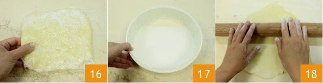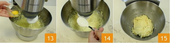 Wenn sich das Eigelb gut vermischt hat, geben Sie das ganze Ei hinzu 13 und mixen weiter; fügen Sie dann das Mehl und das Backpulver, vorher zusammen gesiebt, nach und nach hinzu, indem Sie einen Löffel verwenden 14. Arbeiten Sie die Mischung, bis Sie einen homogenen und weichen Teig erhalten 15.