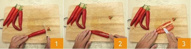 Um das Piri-Piri-Hähnchen zuzubereiten, beginnen Sie mit den Chilis. Spülen Sie die Chilis unter fließendem Wasser ab, tupfen Sie sie mit einem Küchentuch trocken und legen Sie sie auf ein Schneidebrett. Schneiden Sie das Ende mit einem kleinen Messer ab und entfernen Sie den Stiel 1, teilen Sie dann jede Chili der Länge nach in zwei Hälften 2. Schließlich kratzen Sie das Innere mit Hilfe des Messers aus, um die Samen zu entfernen 3.