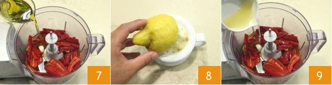 Fahren Sie fort, indem Sie das Olivenöl extra vergine hinzufügen 7, dann schneiden Sie eine unbehandelte Zitrone in zwei Hälften und pressen Sie sie mit einem Entsafter aus 8. Fügen Sie dann den Zitronensaft dem Rest der Mischung hinzu 9.