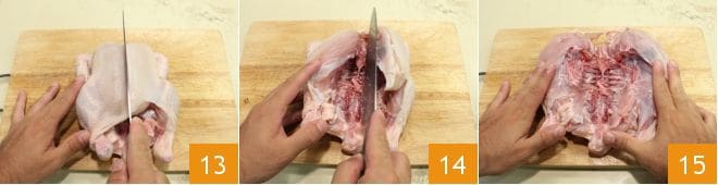 Jetzt kümmern Sie sich um das Hähnchen: Legen Sie das ganze Hähnchen, nicht entbeint und mit Haut, auf ein Schneidebrett und schneiden Sie es in zwei Hälften, indem Sie die Brust durchschneiden (13-14), und achten Sie darauf, die Knochen nicht zu brechen, falls nötig, können Sie dies auch mit einem Geflügelschere tun. Versuchen Sie schließlich, das Hähnchen so weit wie möglich mit den Händen zu öffnen 15.