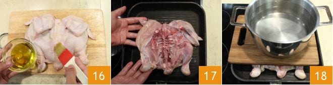 Dann erhitzen Sie die Grillplatte und ölen Sie in der Zwischenzeit die Oberfläche des Hähnchens mit dem Olivenöl extra vergine ein 16. Sobald die Grillplatte heiß genug ist, legen Sie das geölte Hähnchen darauf 17. Um das Garen zu erleichtern, legen Sie ein Gewicht auf das Hähnchen: Hier wurde ein Schneidebrett mit einem Topf voller Wasser darauf platziert 18, dann braten Sie die erste Seite etwa 20 Minuten bei starker Hitze.