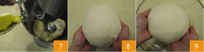 Fügen Sie nun das Öl allmählich hinzu (wie Sie es mit dem Wasser gemacht haben) 7. Wenn das Öl vollständig aufgenommen wurde, nehmen Sie den Teig aus der Küchenmaschine und formen Sie ihn mit den Händen zu einer Kugel 8. Legen Sie ihn in eine leicht geölte große Schüssel 9.