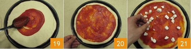 und beginnen Sie, sie von der Mitte nach außen zu drücken, indem Sie bei Bedarf die Seiten leicht ziehen 16. Wenn der Teig zu elastisch ist und dazu neigt, in seine ursprüngliche Form zurückzukehren, legen Sie die Pizza zur Seite, die Sie gerade ausrollen, und fahren Sie mit einer anderen fort, damit die vorherige ruhen kann. Versuchen Sie, den Teig über die gesamte Oberfläche des Blechs zu verteilen 17. In einer separaten, großen Schüssel geben Sie die Tomatensoße hinein und würzen Sie sie mit Salz, Öl und Oregano 18.