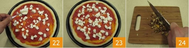 Fügen Sie nun mit einem Teelöffel den Mascarpone hinzu 22. Lassen Sie die belegte Pizza etwa zehn Minuten ruhen 23 und backen Sie sie dann bei 250°C für 12/15 Minuten im statischen Ofen (alternativ reichen zehn Minuten bei 230°C im Umluftofen). In der Zwischenzeit die Walnüsse leicht mit einem Messer hacken 24.