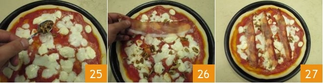 Nachdem die Pizza aus dem Ofen genommen wurde, fügen Sie die frisch gehackten Walnüsse 25 und die Speckscheiben 26 hinzu. Servieren Sie die Pizza mit Mascarpone, Speck und Walnüssen schön heiß! 27