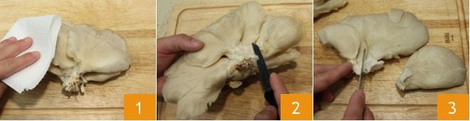 Um die Pleurotus-Schnitzel zuzubereiten, beginnen Sie mit der Reinigung der Pilze: Wischen Sie die Oberfläche der Hüte und den Stiel mit einem feuchten Tuch ab, um die Erde zu entfernen 1. Dann trennen Sie mit einem kleinen Messer die Stiele vom Büschel (2-3) und wischen bei Bedarf mit dem Tuch über die Hüte und die inneren Lamellen, um eventuelle Erdspuren zu entfernen. Bewahren Sie die einzelnen ganzen Hüte für das Garen auf.