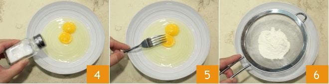 Bereiten Sie nun die Panade vor: Geben Sie in eine Schüssel die zwei ganzen Eier, salzen 4 und pfeffern Sie sie und verquirlen Sie sie mit einer Gabel 5. In zwei separate Schüsseln sieben Sie jeweils das Mehl 6