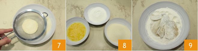 und das Paniermehl 7. Jetzt, da alles bereit ist 8, können Sie beginnen, die Schnitzel zusammenzusetzen: Nehmen Sie einen einzelnen Hut, mehlen Sie ihn ein 9,