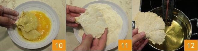 dann tauchen Sie ihn in das Ei 10 und bedecken Sie ihn zuletzt mit dem Paniermehl 11. Sobald Sie die Pleurotus paniert haben, stellen Sie einen Topf mit breitem Boden auf den Herd und erhitzen das Pflanzenöl; für perfektes Frittieren sollte die ideale Temperatur zwischen 170° und 180° liegen. Um die Temperatur zu überwachen, verwenden Sie ein Lebensmittelthermometer. Wenn das Öl heiß ist, tauchen Sie die Pilze ein 12 und braten Sie sie für ein paar Minuten bis zur vollständigen Goldbraunheit,