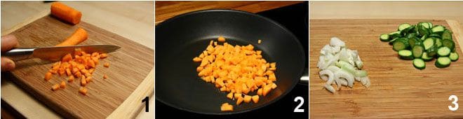 Schneiden Sie die Karotten in sehr kleine Stücke 1 und geben Sie sie in eine antihaftbeschichtete Pfanne mit dem Öl 2; schneiden Sie die Zucchini in Scheiben und die Frühlingszwiebel in dünne Scheiben 3; braten Sie die Karotten einige Minuten bei mittlerer Hitze an