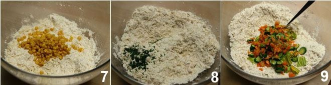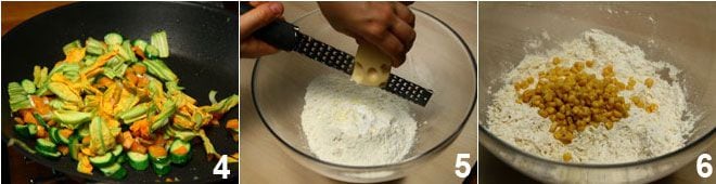 Sieben Sie das Mehl mit dem Backpulver in eine Schüssel und reiben Sie den Käse 5; mischen Sie gut; fügen Sie den Mais hinzu 6 und vermischen Sie ihn ebenfalls, sodass er leicht bemehlt wird;