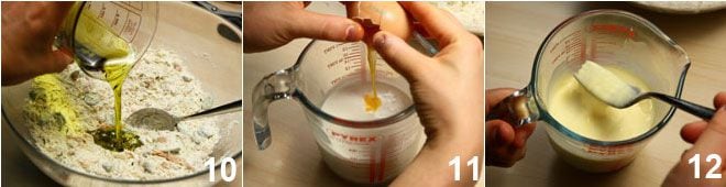 Gießen Sie das Öl in die Mischung 11 und in eine andere Schüssel die Milch, die Sahne und die zwei Eier 11 und schlagen Sie sie leicht 12