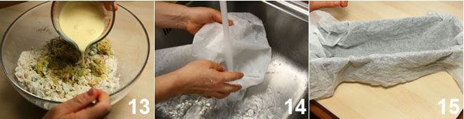 Bereiten Sie die Plumcake-Form mit einem Fassungsvermögen von 1l vor, indem Sie sie mit Backpapier auslegen, das Sie unter fließendem Wasser befeuchtet 14 und dann ausgewrungen haben (dies hilft, es besser an der Form haften zu lassen), verwenden Sie es nun noch feucht, um die Form zu bedecken 15, sodass es gut an den Wänden haftet;