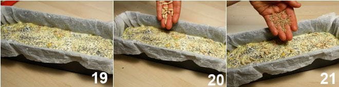 Gießen Sie nun die Plumcake-Masse ein und bepinseln Sie die Oberfläche mit etwas Milch; bestreuen Sie sie mit Mohnsamen 19, Pinienkernen und Sesamsamen (20-21).