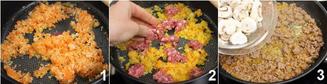 Um die Polentarolle mit Wurst und Pilzen zuzubereiten, beginnen Sie damit, die Karotte, den Knoblauch und die Zwiebel zu schälen und hacken Sie sie dann zusammen mit dem Selleriestiel: Geben Sie das Gehackte in einen großen Topf, in dem Sie 4-5 Esslöffel extra natives Olivenöl erhitzt haben 1. Lassen Sie es bei niedriger Hitze etwa 15 Minuten lang köcheln, ohne es anzubräunen, dann fügen Sie die zerbröselte Wurst hinzu 2 und erhöhen Sie die Hitze, um das Fleisch anzubraten. Löschen Sie mit einem Glas Weißwein (bei Raumtemperatur) ab und fügen Sie dann den gemahlenen Pfeffer, die gut gereinigten und in nicht zu dünne Scheiben geschnittenen Pilze 3 hinzu und lassen Sie alles etwa 10-15 Minuten bei niedriger Hitze unter Zugabe von Salz köcheln. Wenn die Pilze zart sind, fügen Sie die Tomaten hinzu und lassen Sie alles einige Minuten kochen, bis die Sauce eingedickt ist, und passen Sie dann eventuell noch einmal das Salz an,