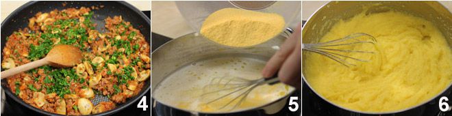 fügen Sie die gehackte Petersilie hinzu 4, rühren Sie um und schalten Sie den Herd aus. Bereiten Sie die Polenta zu, indem Sie das Wasser in einen Topf (am besten antihaftbeschichtet) gießen und es zum Kochen bringen: Fügen Sie das Salz und dann das extra native Olivenöl hinzu und streuen Sie dann unter ständigem Rühren mit einem Schneebesen das Mehl in das kochende Wasser 5, um die Bildung von Klumpen zu vermeiden. Lassen Sie es mindestens 5 Minuten bei schwacher Hitze unter ständigem Rühren kochen 6, dann schalten Sie den Herd aus und