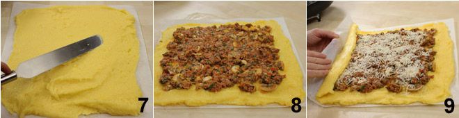 gießen Sie die Polenta auf ein Backpapierrechteck mit den Maßen 30 x 35 cm und verteilen und glätten Sie sie gut 7. Verteilen Sie die Wurst- und Pilzmischung auf dem Polentarechteck 8, lassen Sie dabei zwei Esslöffel für die endgültige Dekoration übrig; verteilen Sie die Mischung über die gesamte Fläche und lassen Sie einen freien Rand von 3-4 cm rundherum, dann bestreuen Sie alles mit 4 Esslöffeln geriebenem Käse 9.