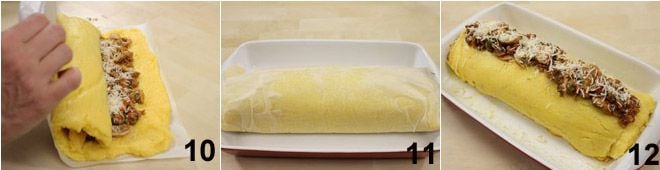Helfen Sie sich mit dem Backpapier, um die noch warme Polenta sofort aufzurollen 10, bis Sie eine Rolle formen, die Sie mit dem Backpapier verschließen 11 und einige Minuten mit der Naht nach unten ruhen lassen, bevor Sie sie in eine mit einem Esslöffel extra nativem Olivenöl geölte Auflaufform legen. Bevor Sie es in den Ofen schieben, bestreichen Sie die Oberseite der Rolle mit der Wurstmasse, bestreuen Sie sie mit einem Esslöffel geriebenem Käse 12 und backen Sie die Polentarolle in einem vorgeheizten Ofen bei 200° für etwa 20-25 Minuten. Nach der erforderlichen Zeit nehmen Sie die Polentarolle mit Wurst und Pilzen aus dem Ofen, lassen Sie sie 10 Minuten ruhen und servieren Sie sie dann in Scheiben geschnitten.