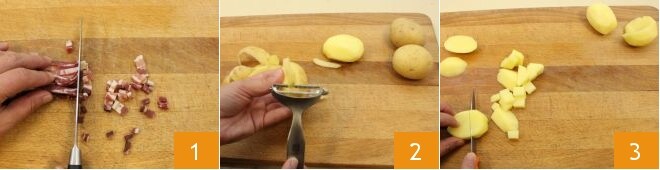 Um die Putenrouladen mit Kartoffeln, Ricotta und Speck zuzubereiten, würfeln Sie den Räucherspeck 1, dann schälen Sie die Kartoffeln 2 und schneiden sie in kleine Würfel 3.
