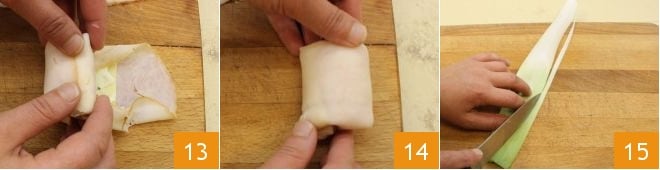 falten Sie dann auch die kürzeren Seiten (13-14). Blättern Sie den Lauch ab, waschen Sie die Blätter und schneiden Sie 12 dünne Streifen ab 15,