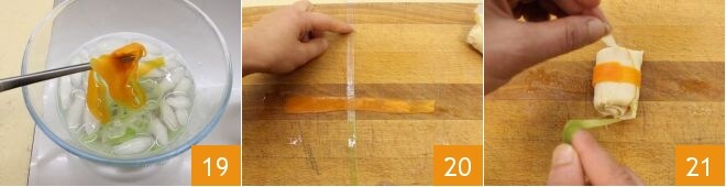 brühen Sie sie in kochendem Wasser 16, um sie weich und elastisch zu machen, und kühlen Sie sie dann ab, indem Sie sie in eine Schüssel mit Eiswasser tauchen 17, um die Farbe zu erhalten. Verfahren Sie genauso mit der Karotte, schälen Sie sie und schneiden Sie mit einem Sparschäler 12 dünne Streifen ab, blanchieren Sie sie, um sie weich zu machen 18
