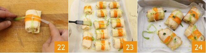 und kühlen Sie sie dann in der Schüssel mit Eiswasser ab 19. Nun binden Sie die Rouladen: Legen Sie auf ein Schneidebrett einen Lauchstreifen und einen Karottenstreifen kreuzweise 20, legen Sie die Roulade in die Mitte und wickeln Sie die Karotte darum und machen Sie einen Knoten oben, machen Sie dasselbe mit dem Lauch 21