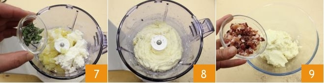 die frischen Majoranblätter und eine Prise weißen Pfeffer 7 und pürieren Sie alles, um eine homogene und cremige Mischung zu erhalten 8. Übertragen Sie die Kartoffelcreme in eine Schüssel und fügen Sie die Speckwürfel hinzu 9, mischen Sie mit einem Löffel und stellen Sie die Füllung beiseite.