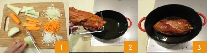 Um das geräucherte Schinkenbein mit Kartoffeln und Sauerkraut zuzubereiten, beginnen Sie mit dem Zerkleinern für das Sofrito: schälen Sie die Karotte und die Zwiebel, und entfernen Sie die äußeren Fäden des Selleries. Hacken Sie alles fein 1 und stellen Sie es beiseite. Geben Sie nun das Öl in ein Schmortopf, vorzugsweise aus Gusseisen, und fügen Sie das geräucherte Schinkenbein hinzu 2. Braten Sie es bei starker Hitze von allen Seiten an 3