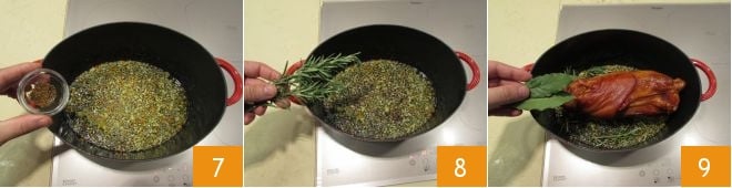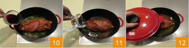 Warten Sie ein paar Minuten und drehen Sie das Schinkenbein häufig, dann löschen Sie es mit dem Rotwein ab 10. Erst wenn dieser vollständig verdampft ist, fügen Sie Wasser hinzu 11, wobei der Wasserstand etwa die Hälfte der Höhe des Schinkenbeins erreichen sollte. Decken Sie den Topf nun mit einem Deckel ab 12 und lassen Sie es etwa 1 Stunde oder bis das Fleisch zart ist kochen, erst dann können Sie es mit Salz abschmecken.