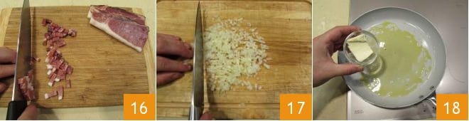 Während die Kartoffeln backen, bereiten Sie auch das Sauerkraut zu, indem Sie den Speck in Stücke schneiden 16 und die Zwiebel fein hacken 17. Geben Sie das Öl in eine Pfanne, fügen Sie die Butter hinzu 18 und lassen Sie sie bei mittlerer Hitze schmelzen.