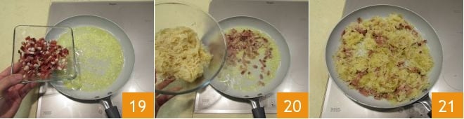 Fügen Sie nun die Zwiebel hinzu, lassen Sie sie weich werden und geben Sie auch den Speck dazu 19. Gießen Sie in der Zwischenzeit das Sauerkraut ab, geben Sie es in die Pfanne 20 und fügen Sie eine Prise Salz hinzu. Braten Sie es bei starker Hitze für 15-20 Minuten, bis es zart ist 21, und fügen Sie bei Bedarf einen Schöpflöffel heißes Wasser hinzu.