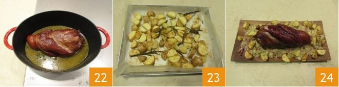 Nun sind auch das Schinkenbein 22 und die Kartoffeln 23 fertig. Servieren Sie sie zusammen 24 und genießen Sie Ihr geräuchertes Schinkenbein mit Kartoffeln und Sauerkraut heiß!