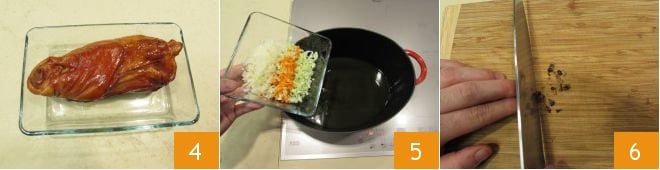 und nehmen Sie es nur dann aus dem Topf, wenn es schön goldbraun ist, und halten Sie es warm 4. Geben Sie das zuvor zerkleinerte Sofrito in das Öl, in dem das Schinkenbein gebraten wurde 5, und lassen Sie es bei mittlerer Hitze anbraten. In der Zwischenzeit zerstoßen Sie die Wacholderbeeren mit einem Messer 6 (alternativ können Sie einen Mörser verwenden, um sie zu zerstoßen)