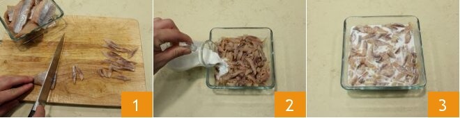 Um den Räucherheringsalat vorzubereiten, müssen Sie die Heringe im Voraus vorbereiten: wenn Sie ungesäuberte frische Heringe verwenden, schneiden Sie den Kopf, den Schwanz und den Bauch ab. Öffnen Sie den Hering, um ihn auszunehmen, entfernen Sie mit der Zange die Gräten; teilen Sie die Filets in Streifen 1 und legen Sie sie in eine Schüssel. Gießen Sie die Milch 2 darüber und lassen Sie die Heringsfilets mehrere Stunden einweichen, besser über Nacht 3.