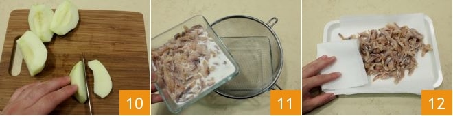 und schneiden Sie die Spalten 10 in kleine Würfel. Nach der Einweichzeit, lassen Sie die Heringsfilets 11 abtropfen und legen Sie sie auf einen mit Küchenpapier ausgelegten Teller, um sie vollständig zu trocknen 12.