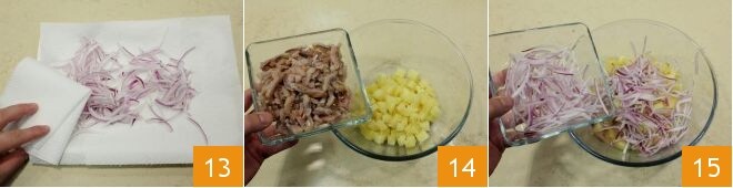 Machen Sie dasselbe mit den Zwiebelscheiben 13, dann stellen Sie Ihren Salat zusammen: geben Sie in eine Schüssel die Kartoffeln, die Heringsfilets 14, die Zwiebeln 15