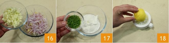 und die Äpfel 16. Mischen Sie alles und legen Sie es beiseite, während Sie sich der Soße widmen: geben Sie in eine kleine Schüssel den griechischen Joghurt und den gehackten Schnittlauch 17. Dann pressen Sie den Zitronensaft 18 aus und filtern ihn.