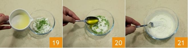 um ihn mit dem Joghurt 19 zu verbinden. Gießen Sie auch das Öl 20 dazu und emulgieren Sie alles 21.