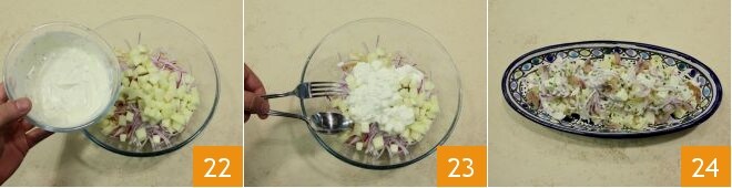 Gießen Sie die erhaltene Creme über den Salat 22, würzen Sie mit Salz und Pfeffer und vermischen Sie die Zutaten gut 23; servieren Sie Ihren Räucherheringsalat als leckere Beilage 24!