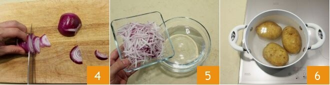 Schälen und schneiden Sie die Zwiebel fein 4 und legen Sie sie in eine Schüssel mit kaltem Wasser 5: auch in diesem Fall lassen Sie sie mehrere Stunden oder über Nacht einweichen und wechseln Sie das Wasser mindestens ein paar Mal, damit sie ihren intensiven Geschmack verliert. Setzen Sie die Kartoffeln zum Kochen auf 6: sie sollten weich sein, aber nicht zerfallen.