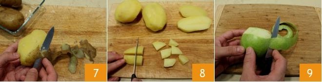 Wenn sie gekocht sind, schälen Sie sie 7, dann schneiden Sie sie in Würfel 8 und legen Sie sie beiseite. Schälen Sie den Apfel 9