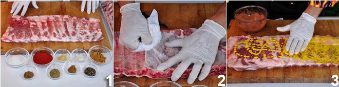 Zuerst beginnt man mit der Vorbereitung der Rippchen 1: Überflüssiges Fett muss entfernt werden sowie die Membran, die die Knochen der Rippchen bedeckt. Um diese letzte Operation durchzuführen, gehen Sie folgendermaßen vor: Heben Sie eine Ecke der Membran mit einem spitzen Gegenstand an und greifen Sie sie mit einem Handtuch 2: dies wird Ihnen einen besseren Halt ermöglichen. Ziehen Sie vorsichtig, und Sie werden sehen, dass sie sich leicht ablöst. Bestreichen Sie nun die Oberfläche aller Rippchen mit Senf 3, ohne zu sparen, und wenn Sie mehr als ein Rack zubereiten, können Sie diese problemlos stapeln. Lassen Sie das Fleisch nun ruhen, während Sie den Rub (Gewürze zum Bestreuen des Fleisches) zubereiten.