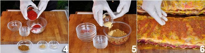Vermischen Sie alle Gewürze in einer Schüssel und rühren Sie gut um, um sie so homogen wie möglich zu vermischen (4-5). Jetzt müssen Sie nur noch den Rub auf die Rippchen verteilen 6, der zuvor aufgetragene Senf wird die Haftung fördern.