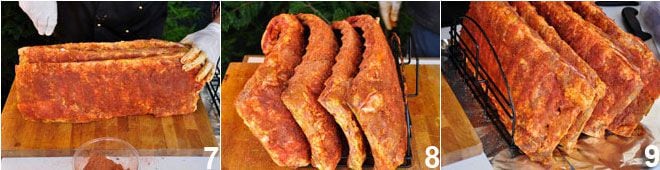 Sparen Sie bei dieser Operation nicht (7-8-9): Die Gewürze bilden eine knusprige Kruste, die den Geschmack dieser Zubereitung hervorhebt. Lassen Sie sie nun im Kühlschrank ruhen, abgedeckt mit einem Blatt Aluminiumfolie, während Sie das BBQ vorbereiten.
