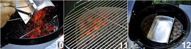 Legen Sie die Holzchips für mindestens eine Stunde in Wasser oder Bier ein. Zünden Sie die Holzkohle oder die Briketts an 10 und legen Sie sie im BBQ an den Seiten der Tropfschale, die Sie zuvor mit Wasser gefüllt haben (11-12) und die Sie auch so halten müssen.