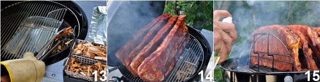 Bringen Sie das BBQ auf die Betriebstemperatur von 110° und legen Sie dann die feuchten Chips darauf 13, indem Sie sie direkt auf die Kohlen legen. Wenn sie anfangen zu rauchen, legen Sie die Rippchen so auf, dass sie sich über der Tropfschale befinden 14 und schließen Sie den Deckel. Der Rauch der Chips hält im Durchschnitt etwa zwanzig Minuten, danach müssen Sie nachfüllen, um das Räuchern für ein paar Stunden konstant und kontinuierlich zu halten. Ihre Aufgabe ist es nun, die Temperatur konstant zu halten, indem Sie die Lüftungsschlitze anpassen. Jeder Stunde sprühen Sie Apfelessig auf das Fleisch 15, um den Raucheffekt zu mildern, falls Sie keinen Sprüher haben, können Sie auch pinseln, aber so riskieren Sie, die empfindliche Gewürzkruste zu beschädigen. Während dieser stündlichen Kontrolle überprüfen Sie auch den Wasserstand in der Tropfschale und ob es notwendig ist, Brennstoff hinzuzufügen.
