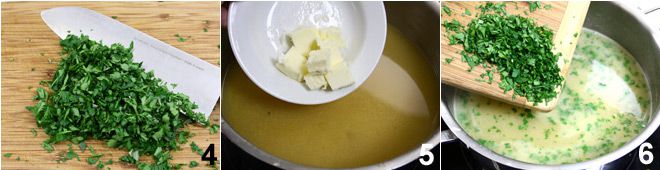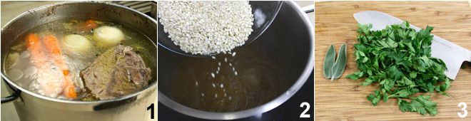 Um Reis und Petersilie zuzubereiten, beginnen Sie mit der Zubereitung einer guten Fleischbrühe 1 (hier klicken, um zu sehen, wie es geht). Bringen Sie sie dann in einem großen Topf zum Kochen und fügen Sie den Reis hinzu 2. Lassen Sie den Reis etwa 15 Minuten kochen, in der Zwischenzeit zwei Salbeiblätter und ein Bund Petersilie reinigen 3