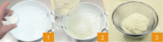 Um die Reiskrapfen zuzubereiten, setzen Sie zuerst einen Topf mit hohem Rand und reichlich Wasser auf den Herd, salzen Sie das Wasser 1, geben Sie den Reis hinzu 2 und kochen Sie ihn etwa 20 Minuten lang. Wenn der Reis gar ist, lassen Sie ihn abtropfen und abkühlen 3.